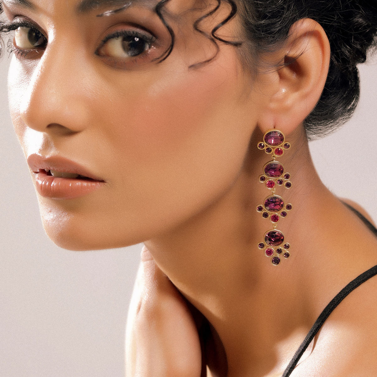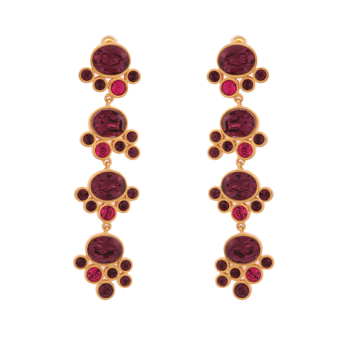 Dangling and fun 18k gold plated sterling silver and dazzling crystals. In amethyst and fuchsia pink crystals.