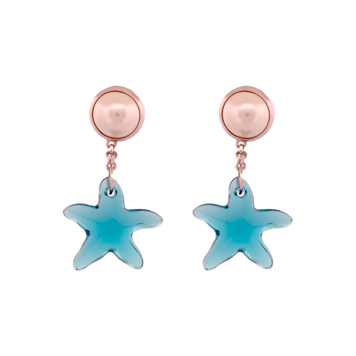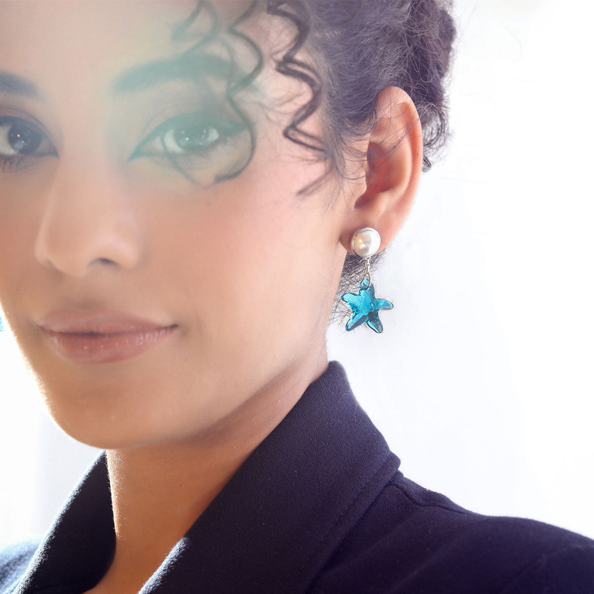 Blue Starfish earrings. Fun and wearable earrings in 18k gold plated sterling silver and dazzling crystals.