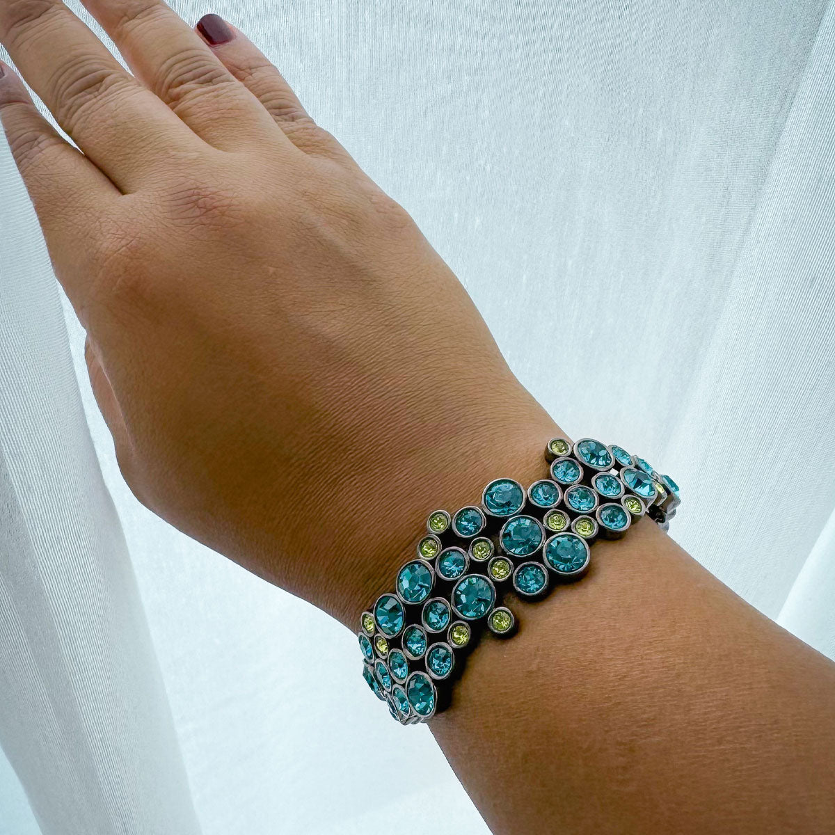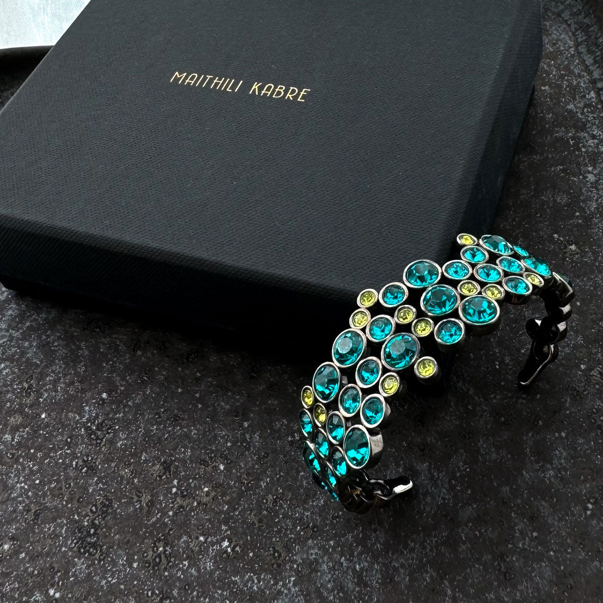 Ocean Cuff: A bracelet that's high on glamour and extremely wearable. Sterling silver and dazzling crystals in aquatic colours and oxidised silver finish.