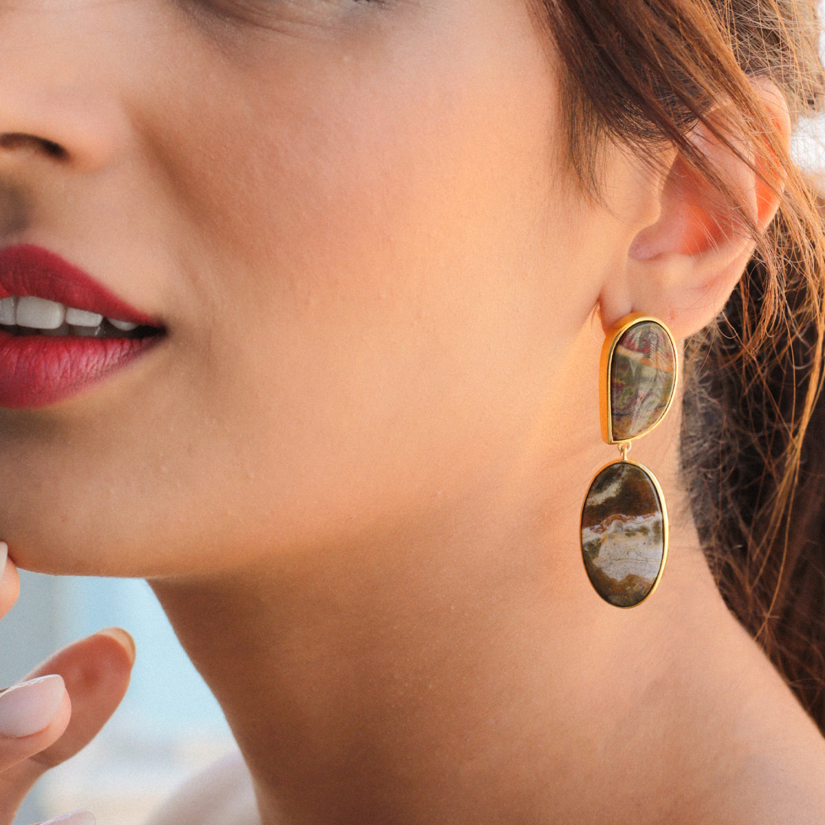 Olive Gold toned Jasper Freeform dangler earrings. Easy and comfortable to wear, perfect for understated looks.
