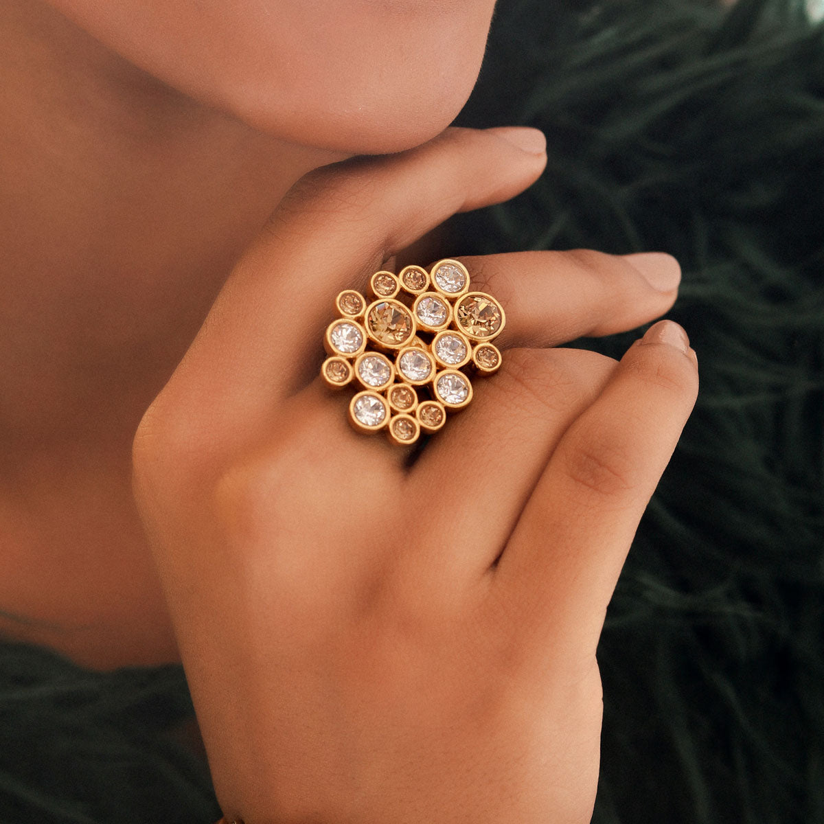 Seafoam Ring: An exuberant design with white and golden crystals This cocktail ring is party perfect