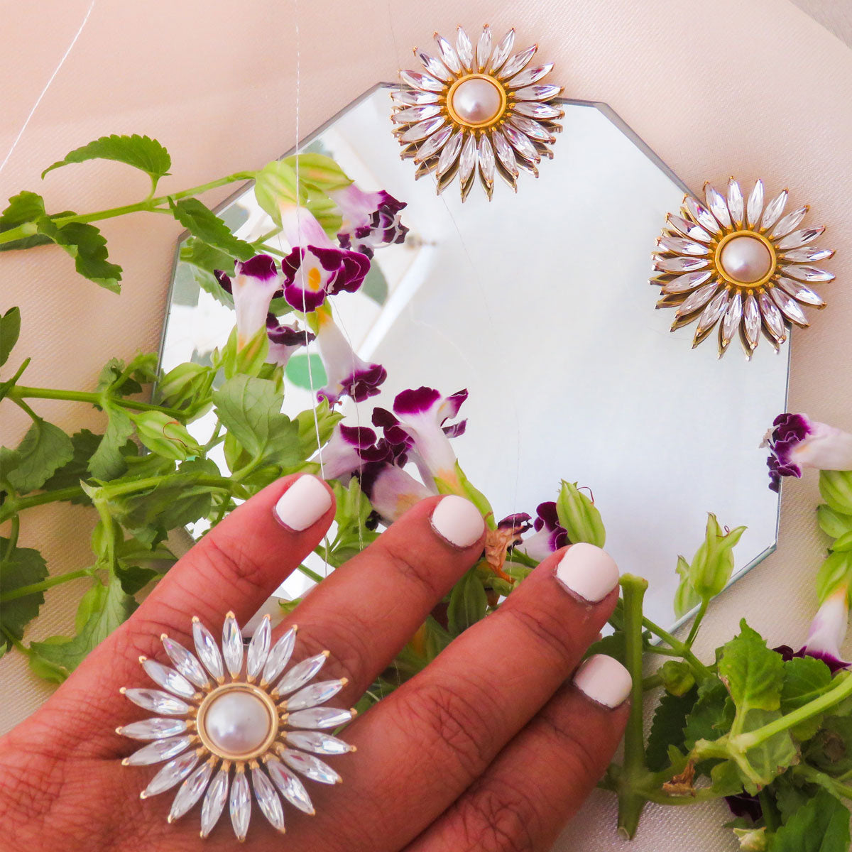 A floral stud like no other. Gorgeous crystal flowers with a pearl centre. Glamorous earrings in 18k gold plated sterling silver and dazzling crystals.